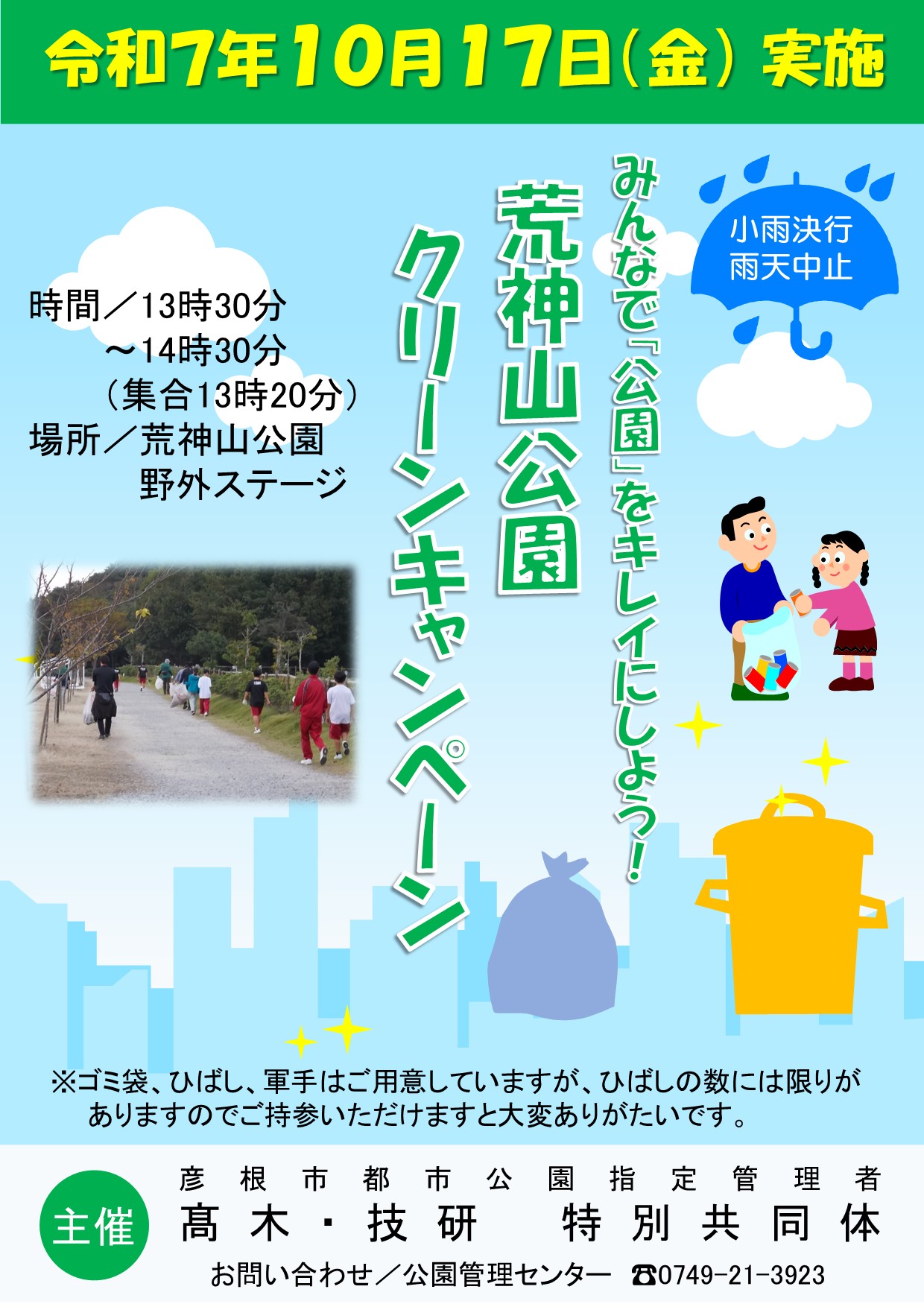 2025荒神山公園クリーンキャンペーン 2025年10月17日(金)の13:30~14:30に『荒神山公園クリーンキャンペーン』を開催します。「市民の皆様に愛される公園づくり」を目指し、毎年地域住民や公園利用者のみなさんと協力して園内の清掃活動を行っています。 ※ごみ袋、ひばし、軍手、飲み物は用意しておりますが、ひばしの数には限りがあります。